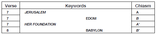 Strophe III (vv. 7-9) returns to the theme of the opposing cities. While in Strophe I, Babylon appeared alongside the non-explicit "foreign soil" as opponents of Jerusalem, this time Edom is specifically mentioned. The references to the nations in the strophe are thus arranged in an alternating ABA'B' sequence as illustrated below: