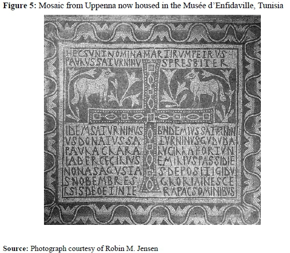The Donatists, from their perspective, saw a clear parallel between their own plight and that of Paul. Like the apostle, they suffered persecution for their beliefs at the hands of the emperor but had not relented from their convictions. (Unfortunately for the Donatists, imperially sanctioned persecution would continue well into the fifth century.) They therefore claimed Paul, along with Peter, as their own legacy and sought to link their own martyrs-the "true" martyrs-to the apostle. This connection between the apostles and Donatist martyrs is made explicit in the dedication of a church in Uppenna (modern Henshir Fraga, Tunisia). A mosaic in the eastern apse of the basilica [Figure 5] reads: "Here are the names of the martyrs: Peter, Paul, Saturninus the presbyter. Likewise, Saturninus, Bindemius, Saturninus, Donatus, Saturninus, Gududa, Paula, Clara, Lucilla, Kortun, Iader, Caecilius, Emilius, who died and were buried on November 8" (Duval 1982, 1:63-67, no. 29; Frend 1940, 33; Monceaux 1903, 334-35).18