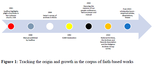 That said, further highlighting the trajectory of the scholarship on faith-based collections is appropriate. Between the publication of the UK's RAG report in 2010 and the commencement of the Master's dissertation project in 2020, from which this article is drawn, there have been a couple of theoretical and empirical papers, including monographs on faith-based collections. The UK's RAG report appears to have influenced research in this genre of archives. Figure 1 summarises the trajectory of interest and growth in the corpus of faith-based works.