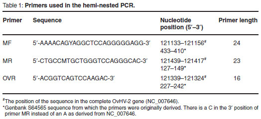 As a result of the problem of contamination associated with a 2-step nested PCR, a single-tube hemi-nested PCR was developed for the detection of OvHV-2 DNA. The method was validated and shown to be suitable for the detection of OvHV-2 in field samples.