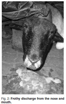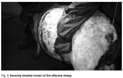 An 8-tooth Dorper ewe (weight estimated to be 65 kg) was presented with a history of consuming a large amount of a pelleted ration which led to an acute, severe bloat (Fig. 3.) and respiratory distress. The ewe was 1 to 2 weeks post partum with triplet lambs. There was a frothy green discharge from the nose and mouth (Fig. 2.). The owner had already tried to deflate the rumen by inserting large gauge needles into it. Introduction of a stomach tube confirmed a complete obstruction in the thoracic cavity cranial to the cardiac sphincter. When removed, there was impacted food (apparently the pelleted ration) present in the end of the stomach tube.
