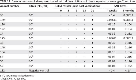 The sheep vaccinated with the low titre vaccine (102 PFU/mL and 103 PFU/mL) were seropositive on ELISA by day 21 post vaccination, and showed varied neutralisation titres of 1:16 to 1:64 within 4 weeks post vaccination. Similar titres were observed at 4 months post vaccination. Those vaccinated with high titre vaccine also had neutralising titres within 4 weeks and also 4 months post vaccination (Table 1).