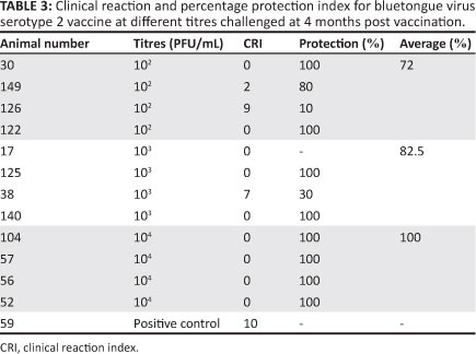 At four months post challenge the sheep vaccinated with the low titre vaccine (102 PFU/mL) had 72% protection and two sheep had very high clinical reaction indexes. The positive control sheep had a high CRI and died on day 8 post challenge (Table 3). The presence of BTV 2 was confirmed by viral isolation.