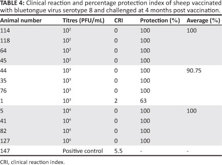 All sheep vaccinated with low titre vaccine (102 PFU/mL and 103 PFU/mL), and challenged with BTV 8, showed protection of 100% and 90.75%, respectively. The sheep vaccinated with the high titre vaccine had a 100% protection level (Table 4).