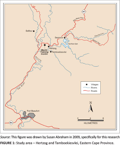 The study incorporated three data-collection phases. The first phase, undertaken during August and September 2008, involved preliminary field research and data collection. It incorporated interviews, participant observation and narrative, and secondary data analysis. During this phase, face-to-face interviews were held with the Eastern Cape's Provincial Director of Veterinary Services (in Bhisho), the state veterinarian, two AHTs (who worked in the Nkonkobe Local Municipality where Hertzog is situated) and a stock farmer. In addition, there was a visit to the Mpofu Training Centre near Hertzog (Figure 1) where farmers are trained in various agricultural practices, including livestock and crop production. These data gathering exercises served to collect information on the extent of state services provided, the problems faced and ethnoveterinary practices.