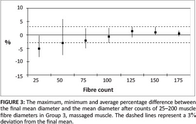 To determine how many fibres should be counted from individual specimens to provide a reliable result, the random measurements from each biopsy were tabulated and mean FD calculated for the first 25, 50, 75, 100, 125, 150, 175 and 200 measurements. These means were then compared with each specimen's final mean fibre diameter and the mean fibre diameter of the group from which it came.