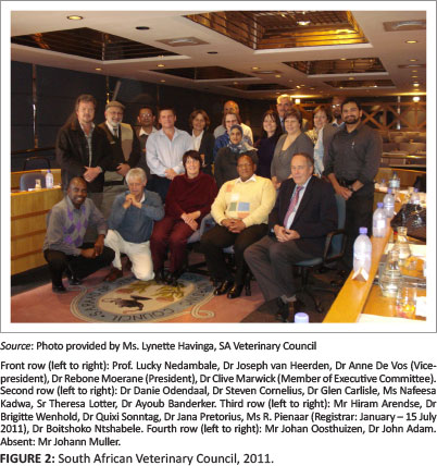 The evolution of the South African Veterinary Board and of its successor, the SAVC, provides a historical perspective of socio-political interest in a uniquely South African context. Three issues are noteworthy. The increasing recognition of the role of the veterinary profession and its necessary support legislation and administration is emphasised. Secondly, the greater emancipation, and subsequent involvement, of women in society and in the veterinary and para-veterinary professions is prominent. Thirdly, the full democratic rights of black people in the South African democracy and their involvement in the profession is an outstanding change since 1994. Nowhere is this better illustrated than in comparing photographs of the 1933 Veterinary Board (Figure 1) and the 2011 Veterinary Council (Figure 2).