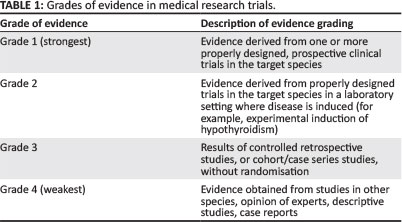 The growing popularity of evidence-based medicine (EBM) has transformed the way clinical trials are performed and, indeed, their interpretation (Cockcroft & Holmes 2003; Geyman 2000; Hjørland 2011; Sackett, Straus & Richardson 2000). The notion of EBM is born out of the observation that clinical observations are prone to bias and that natural variations in clinical outcome of a disease course may be wrongfully attributed to a treatment intervention (Hjørland 2011). Medical practices, whilst firmly based on pure sciences, have retained an element of their artistic origins, with the result that hypothesis-driven research in clinical practice is a relatively new concept (Hjørland 2011). The opinion of experts and clinical experience are still heavily weighted in the clinical realm and a clinician is an individual who draws on many resources to ultimately tailor a clinical treatment for an individual patient. Whilst the role of the clinician's own experience and expertise cannot be undervalued, the observations of the physician, when contrasted with pathomechanistically rationalised treatments, are extremely prone to bias. Hence, with regard to 'strength of evidence', the opinion of experts is seen as the weakest grade of evidence (Hjørland 2011). The philosopher Karl Popper promoted the idea of conjecture and refutation, which states that a scientific experiment should seek to disprove a hypothesis, and that failure to do so would result in the adoption of an alternate hypothesis (Popper 1963). This thought process attempts to force researchers to conscientiously refute their own theories, and only to accept them if they are unable to do so. It becomes apparent, therefore, that clinical trials have to be designed to remove the human element of bias and thus prospective, randomised, blinded clinical trials are considered to yield the best grade of evidence (Hjørland 2011). As with any new paradigm, proselytes quickly accrue. This has certainly been the case with EBM, with a new generation of veterinarians and residents who have become EBM zealots to the point that they are hesitant to adopt any medical practice that cannot be backed up with a paper, thus discarding one of the greatest attributes of the clinician, namely experience and clinical intuition. Those subscribing to a purist EBM approach alone should be reminded of the maxim 'absence of evidence is not evidence of absence'. 1 Recommendations based on EBM, which is a sound practice, should be integrated with clinical experience and individual patient appraisal to achieve the best clinical treatment. Understanding the basis and context of EBM will help veterinarians understand why certain publications are given more weight than others in the development of recommendations, which is particularly true in the case of angiotensin-converting enzyme (ACE) inhibitors (ACEIs). Using the grading of evidence paradigm (Table 1), if grade 1 evidence is available it will generally override contrary evidence of a lower grade.