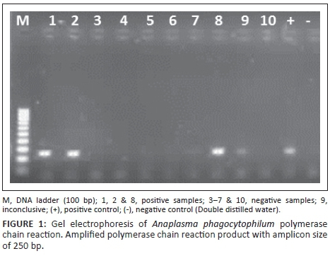 In this study, the species-specific PCR assay was positive for the A. phagocytophilum-like infections from ticks collected from dogs. An A. phagocytophilum-like organism was previously reported from whole blood samples of three dogs in Bloemfontein, identified and characterised by microscopic observation and PCR but was found to (although closely related) differ significantly from A. phagocytophilum (Inokuma et al. 2005; Matjila et al. 2008). Although we reported the presence of A. phagocytophilum in ruminants (Mtshali et al. 2015), the positive detection of this pathogen from dogs, however, requires further genetic characterisation studies, as sequences obtained from this study matched with uncultured Anaplasma species reported from blood of sheep.