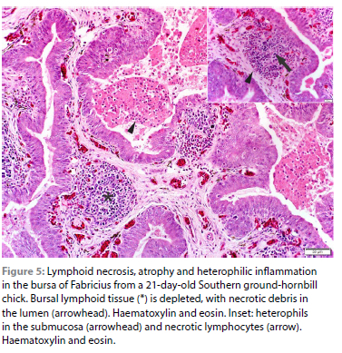 Lymphoid atrophy or necrosis of the bursa of Fabricius, spleen and thymus were relatively common. The true prevalence of these lesions and their relationship to normal age-related changes (R.E. Schmidt, D.R. Reavill & Phalen 2003b) is uncertain because these organs were not always sampled and the number of birds examined was small. Splenic lymphoid atrophy and bursal lymphoid atrophy and necrosis occurred in birds of all ages, suggesting that they were not primarily age-related. However, thymic lymphoid atrophy and necrosis was only seen in chicks older than 12 days; and splenic reticuloendothelial cell hyperplasia was only seen in birds older than 13 days so these could be age-related changes.