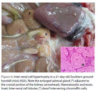 The SANBI NZG wildlife disease database was searched for records of all captive hornbills submitted for a post-mortem evaluation by one pathologist (EPM) following the same protocol, between 2003 and 2017. In total, 90 hornbill necropsies were found with a wide variety of causes of deaths and lesions. Since age at death fell into two distinct age groups the findings in the 40 birds that were under 98 days (three months) old were classified as chicks and are the subject of this paper. Cases were provided by the Johannesburg Zoo (n = 16), Mabula Ground-Hornbill Project (n = 9), Monte Casino Bird Gardens (n = 7), Mpumalanga Tourism and Parks Agency (n = 5), NZG (n = 3); and included 36 SGH, three AGH and a black and white casqued hornbill (from Central and Western Africa, BWCH, Bycanistes subcylindricus). The clinical history, macroscopical findings, results of additional tests (if available) and histological slides for each case were reviewed by a single pathologist (APG). The cause of death or reason for euthanasia was recorded; and morphological diagnoses were assigned for each major organ system. Birds were deemed septicaemic if heterophilic inflammation was seen in multiple organs or tissues. Gram stains and anaerobic culture were not performed due to cost considerations. Adrenal gland hypertrophy was diagnosed by subjective macroscopical assessment of gland size and dwarfing of intervening chromaffin cells by inter-renal ("cortical") cells.
