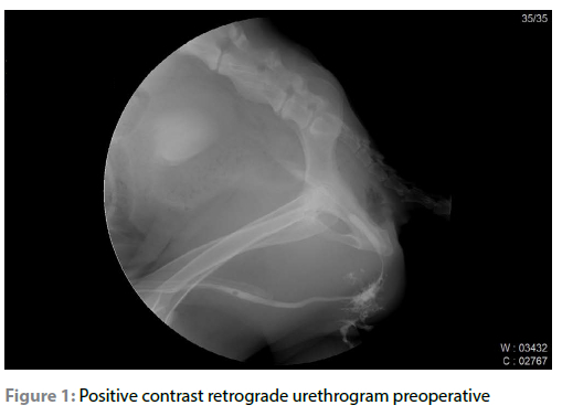 A positive contrast retrograde urethrogram was performed using fluoroscopy (Apelem Bacarra 90/20, Apelem DMS group, France) and positive contrast (Urografin 30% 1 ml/kg, Bayer, Berlimed SA, Madrid, Spain). A diagnosis of traumatic urethral cutaneous fistula suspected to be as a result of previous bite wounds to the perineum was made. The urethrogram also showed a urethral stricture at the bulb of the penis (Figure 1), as well as multiple areas of urine leakage into the tissue surrounding the urethra as well as leakage through the skin.