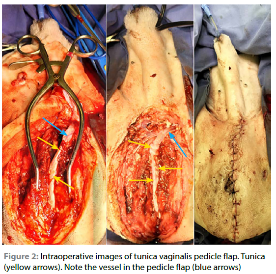 Given the length of the penile urethra that was affected, and the amount of fibrous tissue associated with the urethra and bulb of the penis, a novel technique using a vascularised pedicle graft from the tunica vaginalis after open castration was proposed. The surgery was discussed with the owner who consented to the procedure.