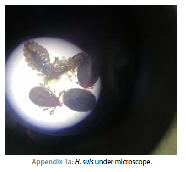 Skin scrapings were done in different areas of the pigs (i.e. on the neck, in the inner part of the ear, the tip of the tail or back of the ear). Care was taken to minimise bleeding from the skin by rubbing a few drops of liquid paraffin into the skin before the surface was extensively scraped with the scalpel. Masking tape was used after the samples had been assembled to seal the slides. The slides were examined under a stereo microscope.
