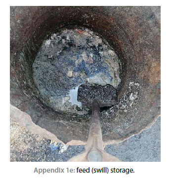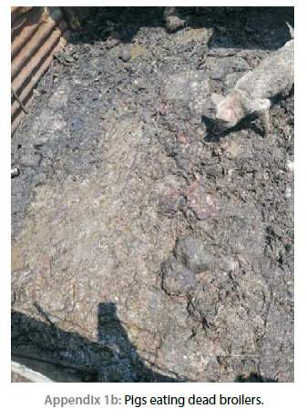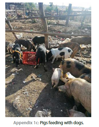 Pigs were seen free-roaming in sewerage areas, streams, immobile dams and crossing roads. In terms of feeding, the following were observed: pigs fed dead chicken and swill, feeders used without cleaning, or disinfecting and being fed from the soiled floor. The use of unwashed drums as storage for swill. Bones, plastics and kitchen utensils were also observed in the pig pens.