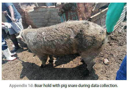 To reduce the risk of trauma and injury to the pigs and the handler, standard pig handling practices were followed. Pigs were managed in line with the Animal Protection Act 71 of 1962 by following standard procedures for handling violent animals in the pig industry. To restrain the pigs during data collection, plastic handling boards and pig snares were used. To minimise stressing the pigs, data was collected as quickly as feasible taking cognisance of the five welfare principles of Webster (Webster 2016).