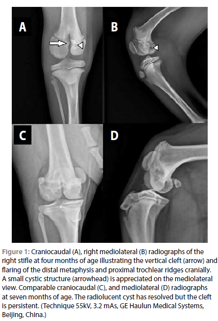 Proposed causes for cleft formation in the distal femur include reduced vascular density of the femoral condyle, lack of appropriate mechanical stimulation secondary to the developmental patella luxation, conformational abnormalities and hereditary or genetic factors that may have resulted in failure of the mineralisation of the femoral cartilaginous anlage shortly after birth. Mucopolysaccharidosis (MPS) VII has been reported in dogs with resultant delayed hypertrophic differentiation of epiphyseal chondrocytes leading to failure of secondary ossification but typically affects multiple joints (Peck et al. 2015). In general, little is known about the aetiology, pathogenesis, presentation and treatment of congenital limb deformities in dogs; in this case, no information was available regarding any traumatic event, inbreeding, environmental or genetic factors with the aetiology in this case remaining unknown. Unfortunately, a major limiting factor in this study is the lack of histopathology to allow correlation with diagnostic imaging. This may have led to less speculation as to the underlying cause.