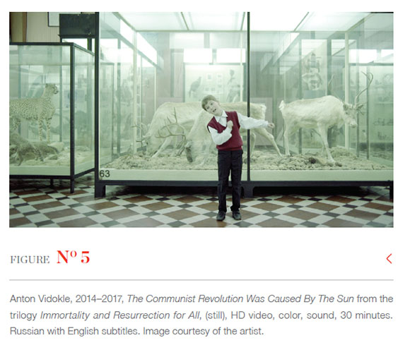 Vidokle's third film, Immortality and Resurrection for All, is filmed at the State Tretyakov Gallery, Lenin Library, and the Museum of Revolution, peopled by a cast of present-day followers of Fedorov. Vidokle illustrates Fedorov's designation of the museum as a site for the restoration of human life. Fedorov claimed that museums needed to be radicalised: that they would not merely collect and preserve artifacts, but also recover life itself. Museums should become factories of resurrection (Fedorov 1906:393). Vidokle zooms into Kazimir Malevich's Black Square21 and Alexander Rodchenko's spatial constructions:22 artists who he and his contemporaries claim as predecessors. Taxidermized foxes bare their sharp teeth, and plastered human mannequins are filmed unraveling strips of plaster (Figure 4). Vidokle leads us through a labyrinth of cases, vitrines, and metal files. He drifts from gallery to gallery, accompanied by the narrator's soothing voice: