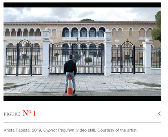 Described by the artist as a 'visual sound portrait', Cypriot Requiem belongs to a body of work that focuses on 'reimagining the power structures of Cypriot, Greek, Turkish and Middle Eastern rituals, investigating and critiquing nationalism and cultural heritage through...music, video art, images and performances' (Papista [Sa]:[Sp]). In Cypriot Requiem this is evidenced in the artist's proposed inhabiting of spaces by which the queer body orients itself in space, occupying it in a way that is disruptive. In line with queer feminist scholar Sara Ahmed's (2006) thinking, such approaches can be understood as calling for a queer phenomenology of space that tends to the spatial inclinations of desire. One may be reminded, here, of Polyviou's erotic dance, in which the queer use of an object (a road cone) and a specific location (the street overlooking the seat of the Cyprus Orthodox Church) are intended to make the queer body visible, where it has been historically excluded.