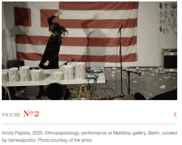 These ideas can be understood in relation to Ethnopapistology (2020), Krista Papista's performance in which acts of queer use are directed at the Greek custom of smashing heaps of cheap china plates on the floor at celebratory occasions, such as weddings (Figure 2). Popularised in film as synonymous with kefi (a Greek sense of fun), the custom was banned in the 1960s by the Greek military dictatorship as demeaning of their conception of Greekness. It persisted, regardless, and has been interpreted by anthropologists as a demonstration of 'unconstrained independence' and a 'creative presentation of the individual self' vis-à-vis the formal image of a national collective self (Herzfeld 1997:x).
