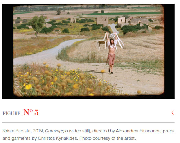 In Caravaggio, Krista Papista's orientation in the landscape entails the energetic movements of the female body in nature, which, although tapping into the stereotype of encoding woman as nature and nature as woman, invite the consideration of ways to journey, experience and gaze upon the landscape - and by extent the body in it - that do not rely on essentialist interpretations. They are also about allowing microhistories that deviate from grand narratives to come to the fore. This is particularly evidenced in the quasi-ritualistic, paganistic performances that occur in the video, which include lighting candles and dancing next to a wooden structure on the shores of a dam. In post-Independence Cyprus, dams (as well as highways, ports and hotels) came to symbolise the island's modern identity contra its colonial past (Daskalaki 2017:2). In recent years, however, they made headlines as the sites where a serial killer, an officer in the National Guard, was burying his women victims. With elements of spirituality of her own invention that entwine with poses of an energetic sexuality, the rituals enacted by Krista Papista in the video - or so the viewers are invited to assume - are about casting out the evil and reclaiming the landscape as well as the feminine, from the spectre of hegemonic masculinity and the violence it produces. Whether positioning herself, then, against local customs and traditions, gendered stereotypes or specific landscapes, Krista Papista embraces an uncompromising position of criticality and infuses the topos of belonging and identity with experiences, narratives, uses of objects and emblems that point to orientations which deviate from official routes.