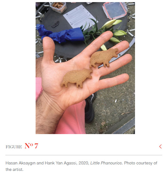 Little Phanourios (2020) is a work that springs from such debated binaries as a collaboration between Hasan and Hank who are seen standing on a trampoline reading a story that blends fact with fiction (Figure 6).13 The fact concerns a species of pygmy hippopotamus, which inhabited Cyprus until the early Holocene, but was hunted to extinction by humans, who would later revere the animal's bones as the petrified remains of Saint Phanourios, the saint of lost things in Greek Orthodox tradition. To account for this custom, scholars named the Cypriot pygmy hippopotamus, Phanourios Minutus, as in "Little Phanourios". In Hasan and Hank's story, Cypriots resurrect the animal with the aid of biotechnology. Yet, genetic malfunctions due to inbreeding lead to the experiment's failure, shattering the Cypriots' dream of using ecology-related projects to derail attention from the island's ethnopolitical quandary. Only a single dwarf hippo survived, named after the Christian saint as a pledge to help recover the lost species, which in Hasan and Hank's story comes to symbolise the island's queer population also threatened with extinction due to its marginalisation. The reading of the story is completed with the offering of phanouropitta in the shape of hippo biscuits - phanouropitta is the pie that must be baked, according to Greek Orthodox custom, when a pledge is made to the saint for finding lost things and people (Figure 7).