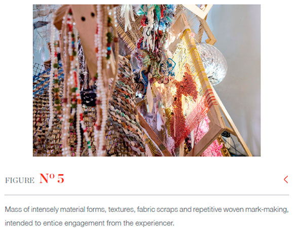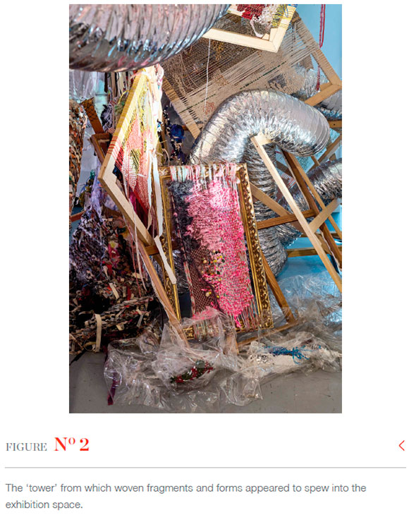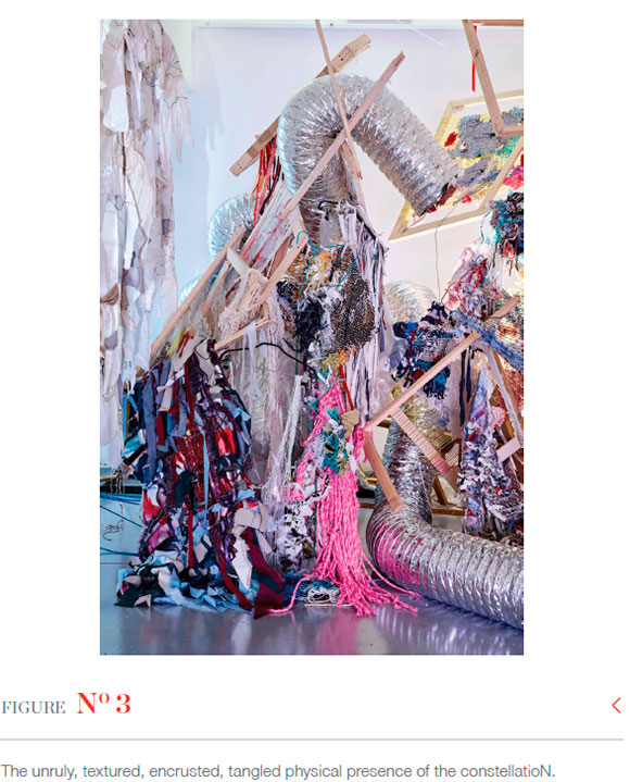 I intended for viewers to be enveloped by the unruly profusion of material presence shown in Figure 3 as they wandered through the constellatioN. Around forty woven, tumultuous, densely overworked, heavily laden, amorphous, dimensional free forms juxtaposed more threadbare ones. Threads criss-crossed haphazardly with endings left dangling. Strewn around were textile offcuts, strings of beads, tangles of plastic and unravelling coloured yarns. Forms spilled out from broken pieces of wooden frames; thick silver air-conditioning ducting wove in and out of the mass like exaggerated thread. Its material intensity felt "otherworldly", holding peculiar resonances that "spoke" to me on multiple associative levels.
