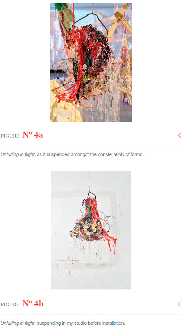 The space held a wide array of making techniques, from weaving, soft sculpture, painting and welding, to video, a sonic piece, and exaggerated light and shadows. Navigating carefully through the constellatioN, Unfurling in flight (Figure 4) came into view. It hung on a clothes hanger suspended from a thread of fishing gut as it rotated gently into a dynamic ever-changing manifestation of itself. Dishevelled and trailing threads of reflective plastic sheeting, its dimensional form bent inwards, and seemed to protect a delicate nesting of beads within its core. Its shape was formed with galvanised wire, which was knotted and woven with multicoloured threads, tatters of cloth and an accent of red ribbon.