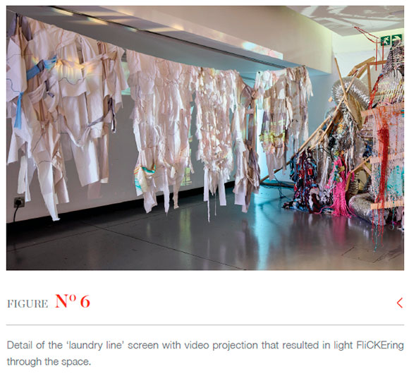 I employed deliberate strategies to activate the exhibition space with the movement of people, sound and light through the constellatioN's multisensory and experiential qualities. Darkness gave a sensory immediacy, heightening the senses other than vision. The air was filled with aromatic fragrances. Cushions placed within the constellatioN encouraged audiences to move freely through its forms and sit among them. Once physically immersed within, the sense of proximity to the variety of textures encouraged touching. Experiencers even moved threads and forms around, so that the constellatioN shifted and took new forms throughout the exhibition period, accentuating its impermanence. The tiniest actions animated the mass of forms to shift in response, emphasising its dynamic nature. gliMMerIng light and daPPled shadows brought further movement and liveliness into the space. Video projection fliCKEred light through a "laundry line" of loosely-woven and porous white weaves (Figure 6), while an accompanying sonic piece reverberated deep sound. A play of light captured elongated shadows that merged with the forms, accentuating textures and dimensionality. shiMMering, sPEckLed light caught the surfaces and pixellation of beads, glitter, plastic, sequins and other reflective materials, which gLinTed bodily - like visceral flesh - as they