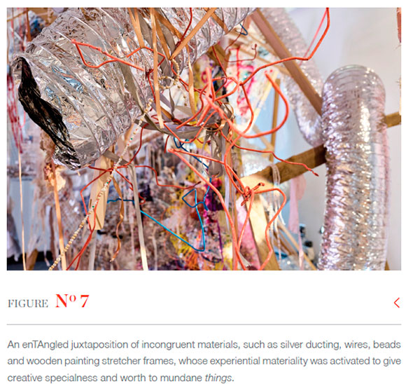 The constellatioN exceeded the form and ontology of its making. Once liberated into the world-flows, its experiential materials became active participants in the enTAngled relationship between experiencer-maker, redirecting the world-flows to reorient perspectives around how we understand notions of self and other. They enabled new formulations of subjecthood and objecthood that moved beyond representation, as enTAngled 'human-nonhuman' assemblages (Bennett 2010:xvii). An enTAngled juxtaposition of incongruent materials, such as silver ducting, wires, beads and wooden painting stretcher frames, whose experiential materiality was activated to give creative specialness and worth to mundane things.