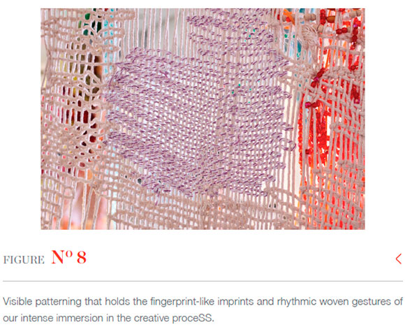 The ritualistic and rhythmic gestures of iterative creative weaving proceSSes impart an indelible and visible sense of pattern, repetition and human touch as they build up surfaces (Figure 8). My rhythms and woven gestures, and those of other makers with whom I collaborate, are imprinted as autographic traces within the surfaces. Our collective movements and creative decisions, along with the enTAngled intimacy and reciprocity of our relationships, get imprinted as fingerprint-like contributions. Woven surfaces enmesh our bodies and lives, materialising the intensity of our embodied gestures and mapping layered traces of making.