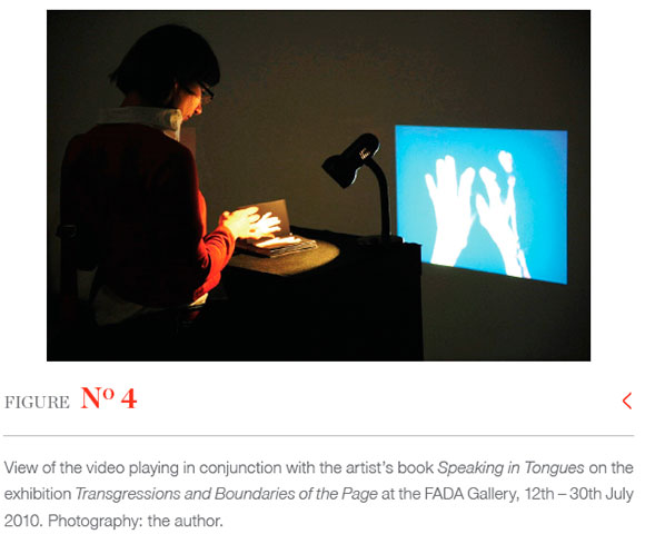 In Speaking in Tongues, I have attempted to convey what Drucker (1995:161) terms enunciation10 - by calling attention to the conceits and conventions by which a book normally effaces its identity. I have achieved this by paying particular attention to the book's self-conscious and reflexive qualities. In doing this I have confronted Drucker's three questions when considering the quality and relevance in artists' books: what was the project set by the artist? How did this work transform, develop, or present that project? And particularly, how does this project work as a book?