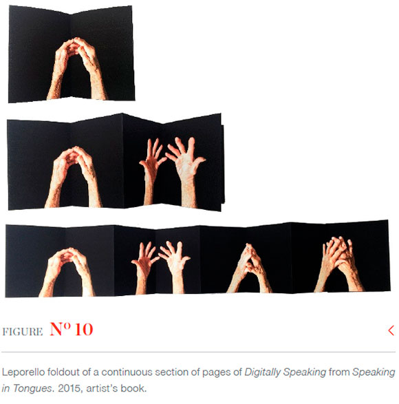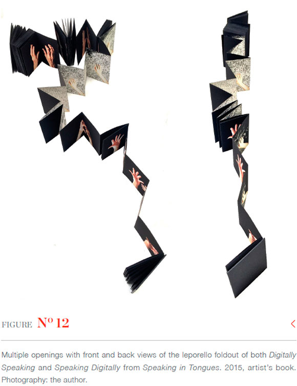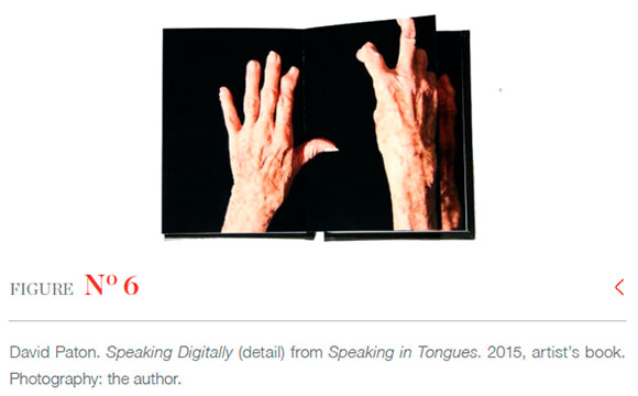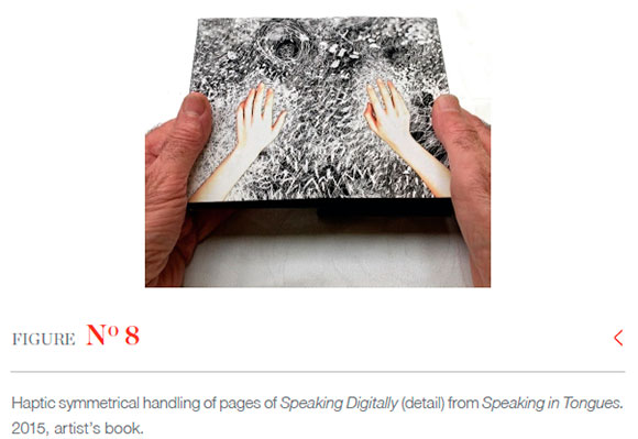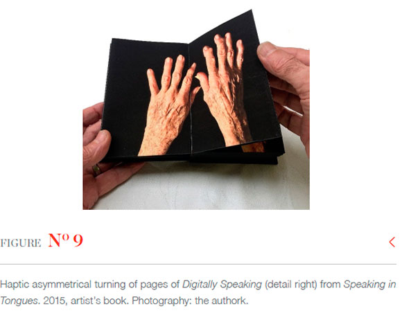 In a conversation with Mark Dimunation, Chief of the Rare Book and Special Collections Division of the Library of Congress, Washington DC, in February 2019, I was intrigued with his response to my description of one particular aspect of Speaking in Tongues. He replied: 'Well that's not what I was experiencing when I looked through your book!' This came as no surprise as I had only related to him one highly personal reading of a section of one of the book's two sides: where the image of my young son's hands disappears from view under a matrix of patterned black ink. Notwithstanding our divergent readings of the narrative - anything other would impose a limit on that text, furnish it with a final signified and close the writing/meaning as Barthes (1977:147) describes - I was interested in his use of the term 'experiencing'. It mattered not that two people had completely different experiences of the meaning of the book, what was important was that both of us experienced the book as a generator of meaning, and this mode of generation was haptic, where technologies of touch are at work as a mode of communication. The subject matter of the work (two sets of animated hands, one old and one young, printed, respectively, on each side of an extended length of folded paper) as well as the intimate scale of the book (153x105mm when closed), invites haptic investigation. It seemed appropriate to me that a reader's hands would manipulate and control the stories told by the depicted sets of hands across generations of experience. Clearly, the hands are narrating something about time through the indexicality of their respective ages and through the viewer's experience of duration and difference in the two narratives.
