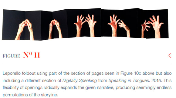 Originally conceived in 2009, the work was presented as a 185-page accordion-fold (leporello) book with independent covers allowing the book to be opened in conventional recto-verso page openings, in extended sections or, with great difficulty, in its entirety. It was small, being only 100mm in spine-height, but thick in depth. It was accompanied by a DVD containing a 15:42 minute video meant to be viewed at the same time as paging through the book. The book was printed in two sections on one side of the paper only. The first section depicted a sequence of my young son's hands subtly moving whilst playing an online game, the second depicted my aging mother's expressive hand movements that animated a set of spoken memories of her youth. The book contained no text except for the subtitles: Speaking Digitally introduced by my son's hand section and Digitally Speaking, introduced by my mother's.