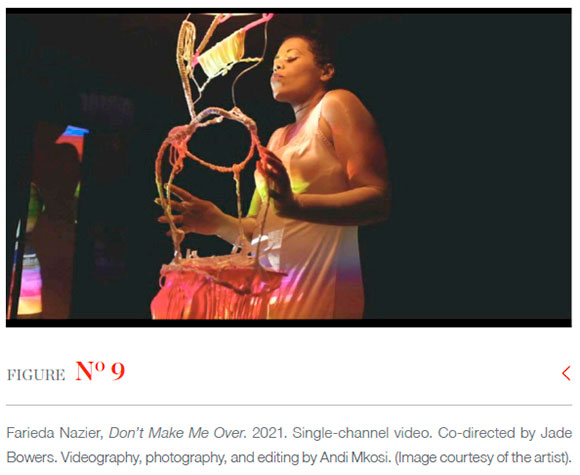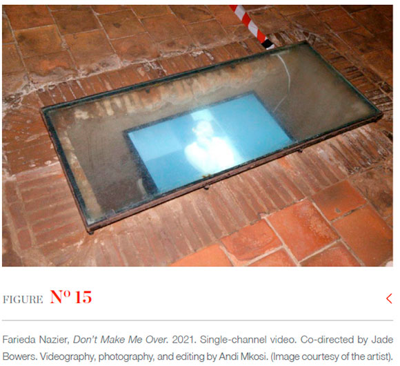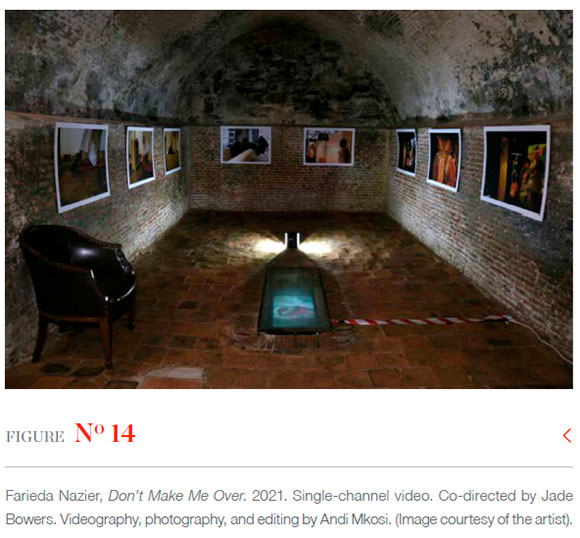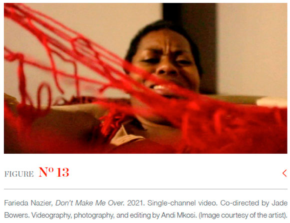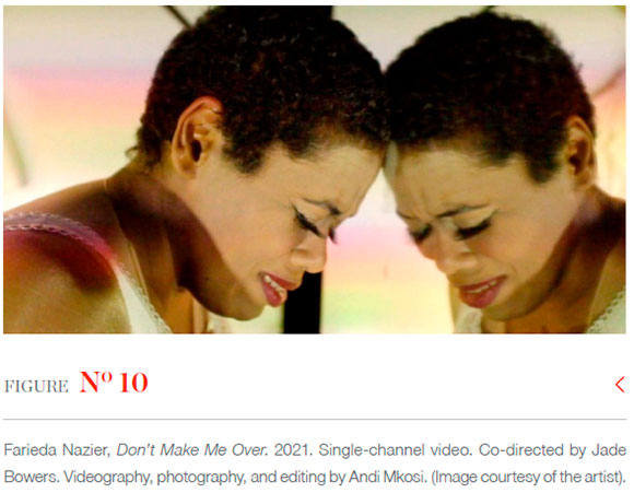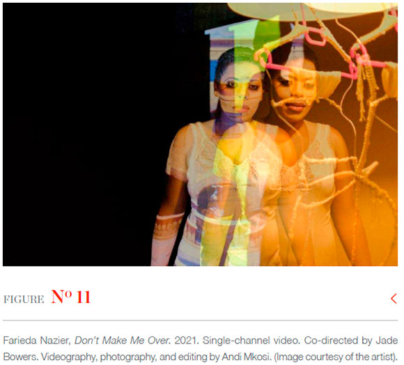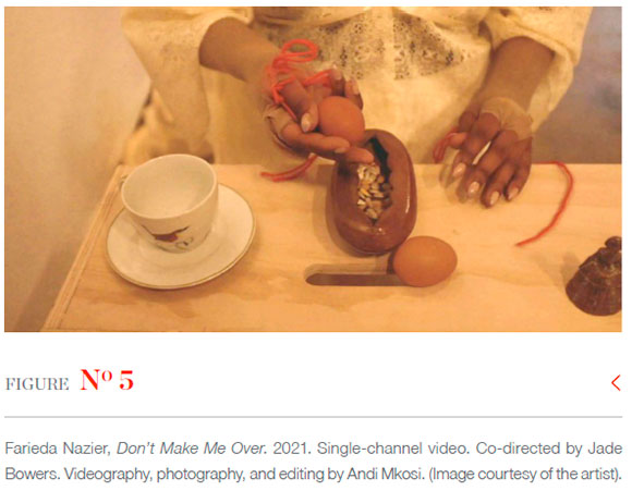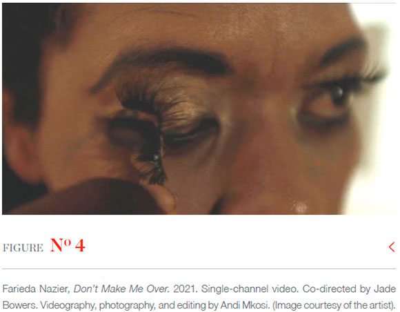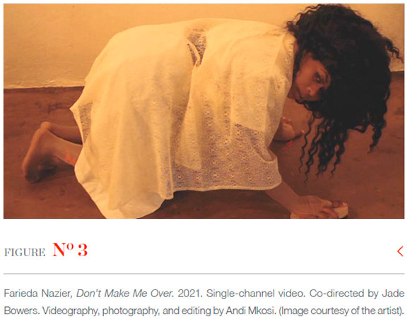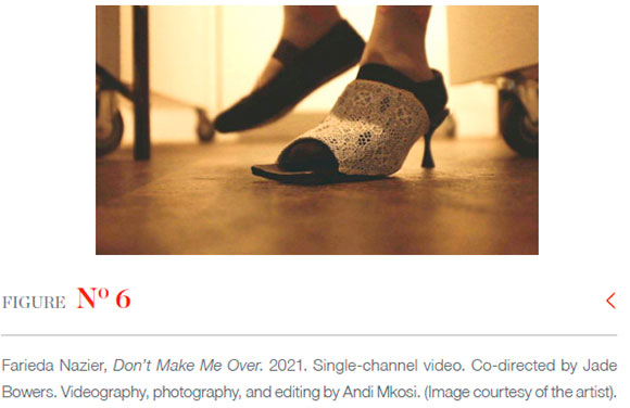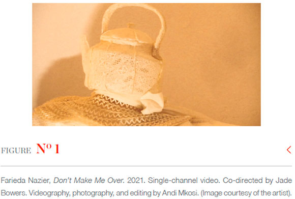 Don't Make Me Over (2021) is a videographic piece by South African artist Farieda Nazier comprising performance, music, poetry, curated settings, and sculptural assemblages, which forms part of her Post(erity) Project. The title-Don't Make Me Over-is based on the 1962 song of the same name originally recorded by Dionne Warwick and later covered by Sybil in 1987. While an integral and fundamental component of the work, the artist emphasises that her interpretation of the popular hit is not a music video. Throughout this article, I discuss how Nazier enacts scenes of both compliance and defiance against the conflation of femininity and the domestic milieu, and the embodied violence of patriarchal norms dictating feminine 'beauty' and behaviours. Moreover, I examine how the video implies an abusive relationship dynamic in which the female subject appears entangled, set against the backdrop of The Forge theatre in Johannesburg, thereby implying the masquerade of gender identity as theorised by Judith Butler (1999), and emphasising the narrative quality of the work as a whole. Throughout this discussion, I draw from various feminist paradigms to frame my insights and for the purpose of analysis, namely postmodernist,1psychoanalytical,2 and intersectional feminism.3