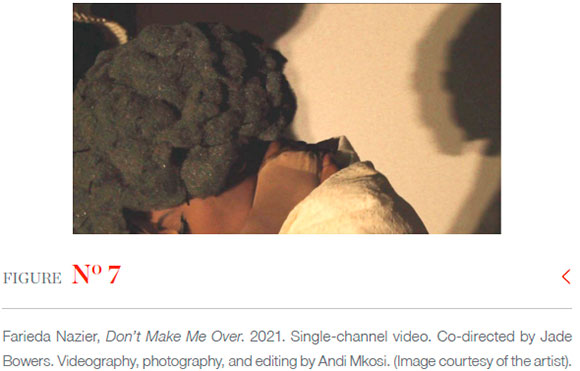 With the abovementioned notions of slavery and associated sexual and other acts of violence as its point of departure, Don't Make Me Over developed after that to consider the multitude of ways in which women of all races may find themselves 'enslaved' in the contemporary moment, particularly those bound to toxic relationships and cyclical patterns of abuse. This exploration reveals Nazier's interest in intersections and pluralities of power which occur (particularly) in heteronormative relationships, and the role of patriarchy in this imbalance. Therefore, Warwick's song, as sung by Nazier throughout the video piece, was apt for conveying a message centred on covert abuses. Having been familiar with the R&B version of the song by Sybil, which often played on the television and radio in the late 80s and 90s when she was growing up, and to which she and her sister would sing along with as children (oblivious to its darker undertones), Nazier began thinking about the subjectivity of violence and how trauma continually remakes one's identity (Nazier 2021c).