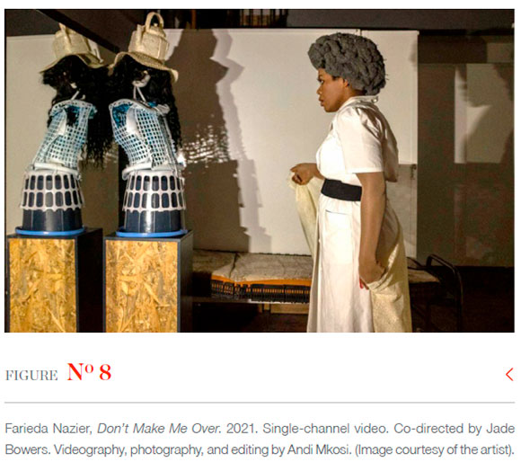 Moreover, Nazier's performance as another self conveys that gender as a construct is staged-a concept reinforced by the location of The Forge Theatre in De Kort Street, a community-based and politically charged initiative where the video was shot and later exhibited. In fact, Don't Make Me Over was initially conceptualised as a piece to be performed live at both the Castle of Good Hope and The Forge. However, in response to the physical limitations of the Covid-19 pandemic, Nazier opted to film her performance instead and incorporate her sculptures to create a videographic work more appropriate for online viewing.11