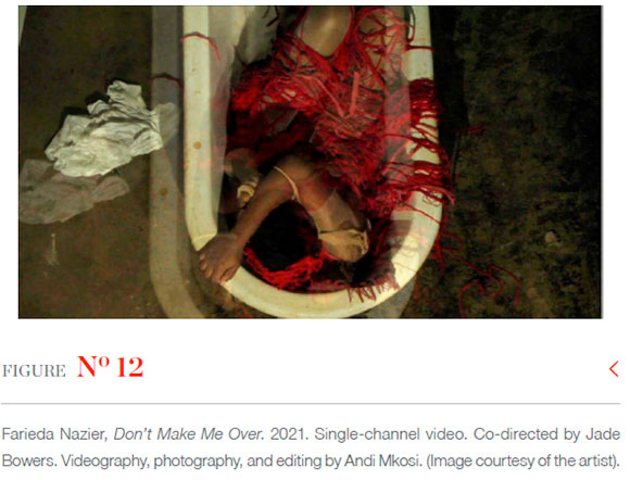11 The artist originally envisioned the performance as approximately ten minutes long and constituting a bathtub installed in the physical space of the Caste of Good Hope and The Forge respectively. She had planned to engage with the bathtub during her performance in much the same manner captured in Don't Make Me Over, by first disrobing then immersing herself in the 'water' of the red thread, as well as pushing it through the mincer, which incidentally features less in the videographic work than was intended for the live version. These actions were to be executed while the song Don't Make Me Over played concurrently in the room. However, once the work was adapted into a videographic format, it took on a more complex narrative quality comprising multiple scenes, settings, and costumes, albeit shorter in duration. Its development was the result of the collaboration necessitated between the artist and a production team, including co-director Jade Bower and photographer Andi Mkosi (Nazier 2023).