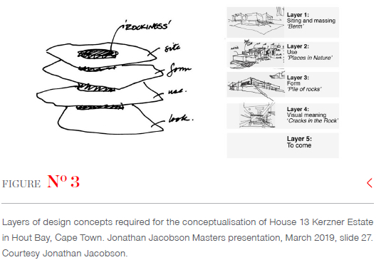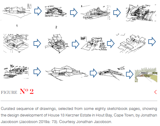 There are many ways to conduct designed-based research, and each designer will likely take up the challenge in a personal and original way. To elaborate on this, I cite work currently underway in the master's and doctoral degree programme in architecture, specialising in design, offered at the UFS. At the time of writing, Jonathan Jacobson, for example, is completing his practice-based PhD entitled 'In(de)finite: complexity and ambiguity in the architecture of the house' (Jacobson 2020-). His journey began with his practice-based master's thesis, 'Ha! Kerpow! What? No! OK. Maybe: Improvisation in the collaborative architect-client relationship' completed in 2019. In the latter, Jacobson (2019a) examines the conceptual development of a single project-House 13, Kerzner Estate-to understand his complex and often lengthy design processes (see Figure 2). He situates this study within what he calls a 'client-centred' approach-as opposed to a 'professionally-centred' approach-which allows for and encourages collaboration with the client. More specifically, he studies, in substantial detail, the large number of sketches that were needed to develop a satisfactory design concept - satisfactory for both architect and client. Jacobson describes his process as a jazz-like improvisation that plays out between architect and client, and which is facilitated by an acceptance of 'uncertainty,' 'open-endedness,' 'delayed resolution,' 'provisionally,' and 'integration' (Jacobson 2019a:71-74). He discovers that his final concept for the house is far more complex than he initially imagined; it is richly layered, flexible and resilient (see Figure 3).