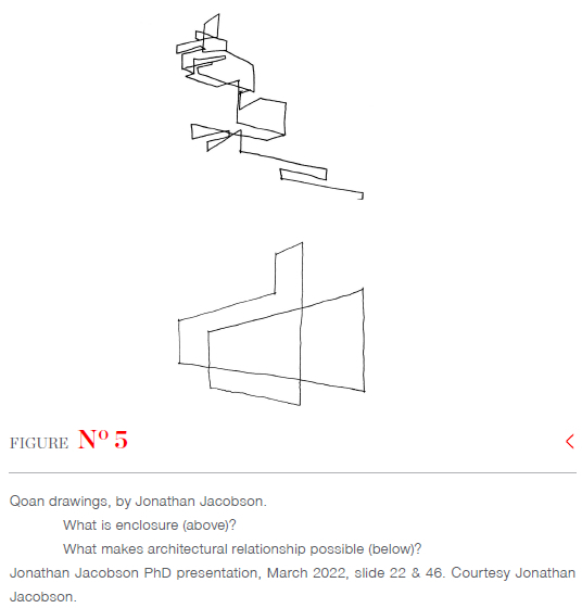 In his PhD research, Jacobson now hopes to explore the mysterious and 'in-definite' qualities of his built work which appear to issue from the improvised and layered character of his design processes. To this end, he has introduced a new mode of conceptual drawing, namely the qoan (see Figure 5). Qoans may be described as conceptual, drawn abstractions that explore various spatial, relational or environmental ambiguities. Qoans belong to the design process and, most importantly, they possess exploratory and emergent qualities and are not merely intended as a representation of something.