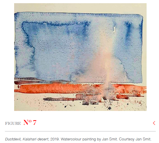 Consider Jan Smit's PhD journey to illustrate the above. Smit is enrolled in the Architecture Department at the UFS, where he is currently completing his practice-based PhD entitled 'Mediating landscape: the power of art in the design process' (2018-). Jan and his wife, Petria Smit,8 are the principals at Smit Architects. They work within a critical regionalist tradition and are clearly influenced by the architectural theories of Christian Norberg-Schulz; in particular his notion of genius loci (Norberg-Schulz 1980) (see Figure 6). The Smit practice has a large body of work, and the first step was to select the important projects, and to establish timelines, define families of projects, points of transition and reoccurring themes, together with salient aspects of Smit's contribution to the design process. Upon presenting this, an aspect that stood out is the fact that Smit always starts his process with the site, often producing watercolour paintings of the surrounding landscape, to tune his sensibilities to the unique character of the place. Not very many architects do this, and Smit is indeed an accomplished watercolourist (see Figure 7). Highlighting this act of painting raised the question as to what this might have contributed to his design process? Are there clear relations between his landscape paintings and his designs? More importantly, could watercolour painting be used as a medium for research?