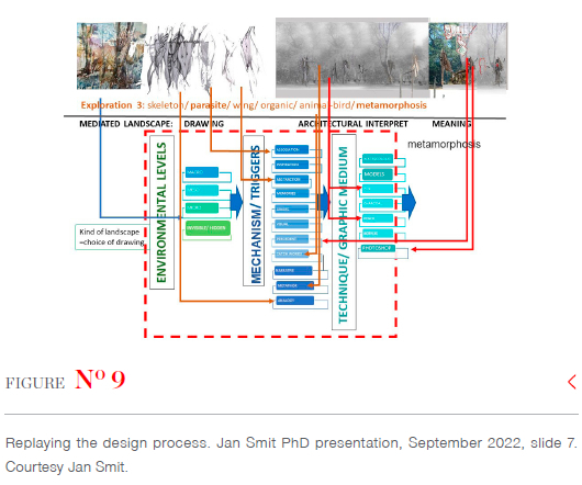 A process is something that can be run forwards or backwards. It may be repeated, sped up or slowed down. With Smit's PhD, it is almost as if he hit rewind on his creative process, playing it back again, revisiting the process-only now with the benefit of hindsight, renewed understanding and a transformed mode of practice (see Figure 9). His identification of a gap with respect to landscape art and land art was crucial, inviting him to enter this gap primarily through the practice of drawing and painting.