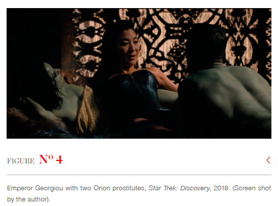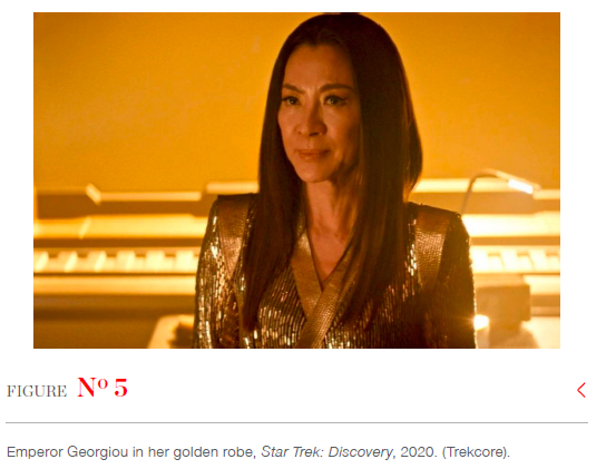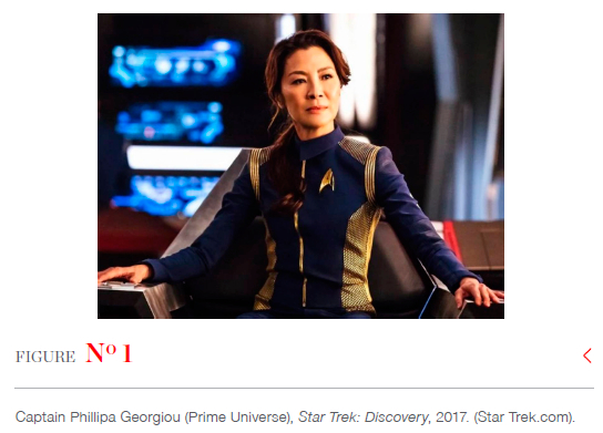 In 2017, in Season 1 of DSC, postfeminist portrayals of female empowerment linger despite DSC's apparent critical stance on gender, racial and sexual inequalities. Phillipa Georgiou (seen in her Starfleet uniform in Figure 1) is first introduced to viewers as a Starfleet captain (in the Prime Universe), but suffers an untimely death as early as the second episode. In episode 11, 'The Wolf Inside', when the USS Discovery crosses over to the infamous Mirror Universe-which, being the opposite of the Prime Universe, is governed by a violent, racist and totalitarian regime, the Terran Empire-it is revealed that the Mirror version of Captain Georgiou is in fact the Emperor of this Empire.2 This is, of course, highly ironic, as Captain Georgiou represents the epitome of Starfleet diplomacy and liberal humanism-she never steps out of line, she embraces all races and species, and she is a consistent voice of reason for her crew and especially for Michael Burnham (the main protagonist).3 In the pilot episode, for example, when the Shenzhou stumbles upon the Klingon flagship, Burnham is convinced that they should fire first to display Starfleet's dominance and superiority. Captain Georgiou, instead, intends to follow Starfleet Command's orders and wait for the fleet to arrive and open a channel of communication to make first contact diplomatically-a far more reasonable and conservative course of action.