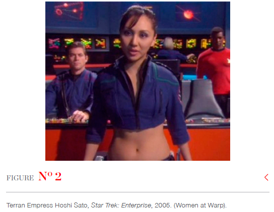 In true postfeminist fashion, while being female rulers who do not submit to the patriarchal order of The Federation, women in the Mirror Universe are almost always portrayed as 'hyper-sexualized versions of their Prime Universe counterparts' (Raucher 2020:246). Figure 2, for example, shows Empress Hoshi Sato, whose cropped top uniform flaunts her slim stomach; in the Prime Universe, Sato wears a boiler suit that covers her entire body and does not draw attention to her figure. As Rauscher (2020:243,251) further explains, in contrast to the Prime Universe, in the Mirror Universe, 'the empowerment of women depends on their integration into totalitarian, militaristic structures that rely on openly imperialist and racist ideologies', wherein they are 'willing to do whatever is necessary' to gain power. As such, the women of the Mirror Universe's empowerment is, like postfeminism, somewhat ambiguous, as it is predominantly built on violence, sexualisation, and the exclusion of anything deemed "other".