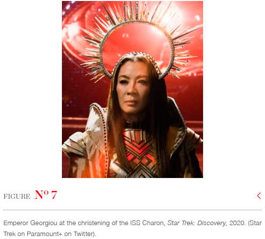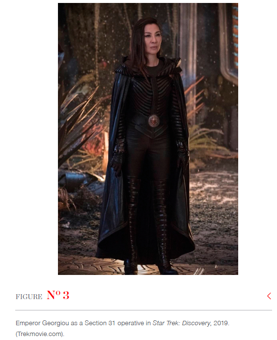 Emperor Georgiou initially follows in this legacy as a female ruler in the Mirror Universe. In contrast to her Prime Universe counterpart, Captain Georgiou (see Figure 1), Emperor Georgiou uses sex, manipulation, and violence to secure her position of authority in both the Mirror and Prime Universes. DSC is rife with elaborate fight scenes (executed skilfully by the experienced Michelle Yeoh) that display Emperor Georgiou's 'masculine assertiveness and power' (Genz 2009:152,155), and her solution to conflict usually involves resorting to violence. Moreover, following the postfeminist tradition of depicting powerful women in the Mirror Universe as 'hyper-sexualized', Emperor Georgiou also dresses in 'dominatrix-style outfits' in contrast to Captain Georgiou, who is always shown in her unisex Starfleet uniform (see Figure 1) (Rauscher 2020:246). As seen in Figure 3, which exhibits one of Emperor Georgiou's many elaborate outfits, she is clad in a tight leather corset, with tall, high-heeled boots and an emblem strategically placed to draw attention to her groin. In these ways, like the postfeminist action heroine, Georgiou uses violence (as a traditional signifier of masculinity) in combination with her feminine (and sexualised) body to imbue 'old signifiers of...helpless femininity with new meanings of strength and agency' (Genz 2009:152,155).