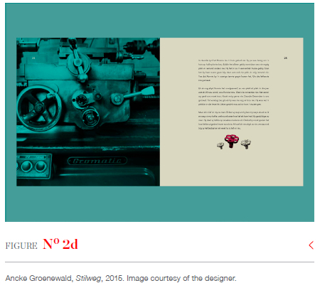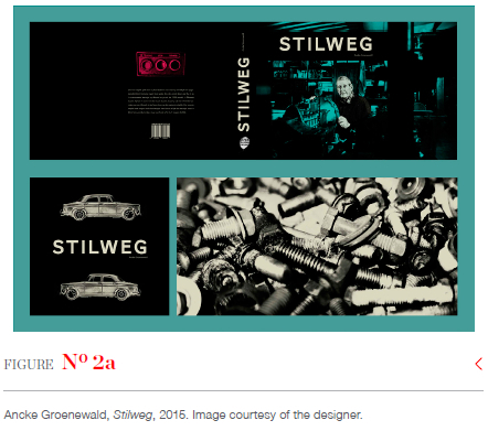 In the project Stilweg's creative rationale Groenewald (2015) explains, 'I chose to design and write a book about my grandfather. [His] hobby ... is to restore cars older than 40 years. It isn't only his hobby that I chose to write about but rather his entire life.' As an example of how her writing informed critical creative decisions such as the book's title and chapter headers, which just use one or two highly descriptive words, she explains, 'He is a very quiet person and likes to be alone. Therefore, I decided to use the word "Stilweg" as a title for the book, which means quietly. Examples of chapter titles are "Kaalvoetnooi" (barefoot lass), "Handewerk" (handywork), "Rover" (a car brand), and "Reinol" (hand cleaner)' (Groenewald 2015).