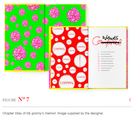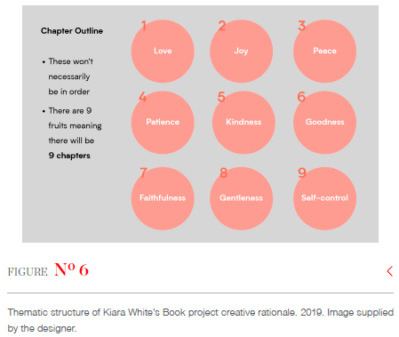 As White conducted interviews with her subject, she was able to identify key themes that determined the book's narrative structure as well as the tone of voice for each chapter (Figure 6). The process of deeply engaging with the research and writing in her role as author enabled White to plot a well-structured narrative. This, in turn, allowed her to make effective strategic and creative decisions quickly, which enabled her to produce more than double the amount of work than her peers generated within the same deadline parameters. This clearly indicates one of the benefits of designers engaging in writing because it makes them more productive and efficient, as noted by several other sources mentioned earlier in this article.