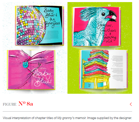 The designer/author's writing informed her approach to imaging, type, layout, and colour choices that are authentically reflective of the book's protagonist and life narrative. Furthermore, in feedback provided during the curatorial process of the Stories Worth Telling exhibition, Groenewald (2023) states: