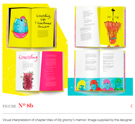 This section provides selective examples from the Stories Worth Telling retrospective exhibition (2023) that illustrate how engagement in creative writing benefits the designers in making effective design decisions that scaffold all aspects of visual and verbal narrative and storytelling. These examples illustrate how engagement in self-generated writing creates deep understanding and empathy with content, which enhances all aspects of decision-making during the design process that, in turn, results in authentic design solutions that move beyond mere aesthetics.