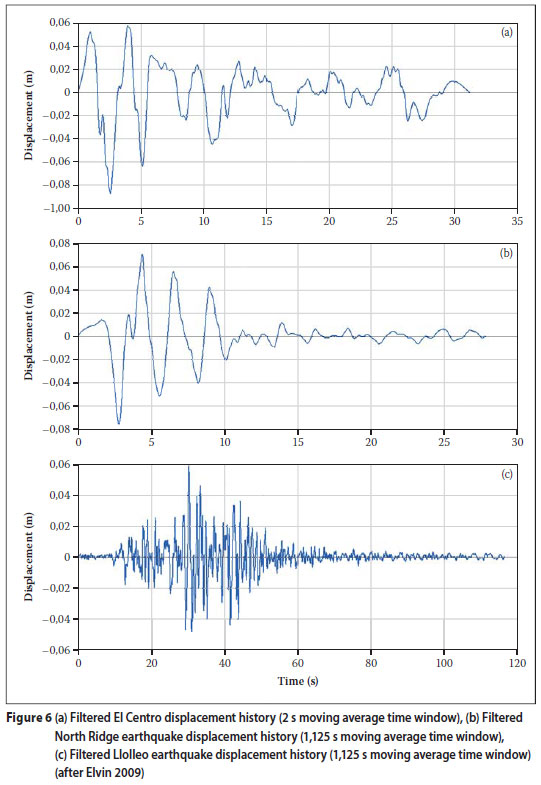 The usual control parameter for servohydraulic test machines is displacements. To obtain the displacement time histories of the earthquakes, the acceleration traces were double-integrated numerically using the trapezoidal rule (see Elvin (2009) for details and discussion). The resulting histories showed that the range of displacements of each earthquake was large, falling well outside the range of the 150 mm stroke of the Transnet Facility actuator used. The displacement histories were high-pass filtered using the moving average approach, as described in Elvin (2009), to produce the time sequences shown in Figure 6. As can be seen from this figure, the filter was designed so that the displacements of the three earthquakes were within the stroke range of the actuator.